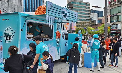 지난 26일, 27일 서울 성수, 신촌에서 먼저 진행된 ‘출동 후레시맵’ 캠페인은 매장들의 적극적인 참여를 통해 좋은 반응을 이끌어냈다. 쿨비빔콘트럭에는 친구·연인과 나들이 온 젊은 층부터 어린 자녀를 동반한 가족 및 중장년층까지 고른 연령대로 구성된 대기줄이 길게 형성되며 제품을 향한 높은 관심을 입증했다. 후레시맵 요원들은 활기찬 태도로 ‘맵탱 비빔면’을 소개하고 이벤트 참여를 유도하며 현장 분위기를 이끌었다.